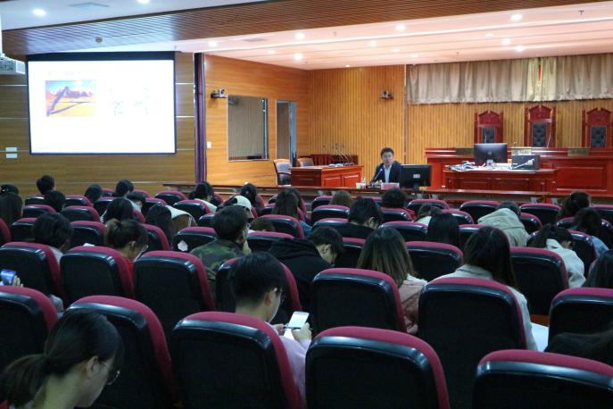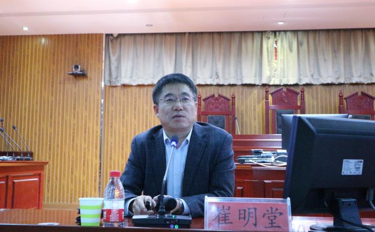 党委副书记崔明堂在文荟楼模拟法庭为学院分党校培训班学员讲“不忘初心、牢记使命”专题党课《坚定理想信念 凝聚青春力量》。