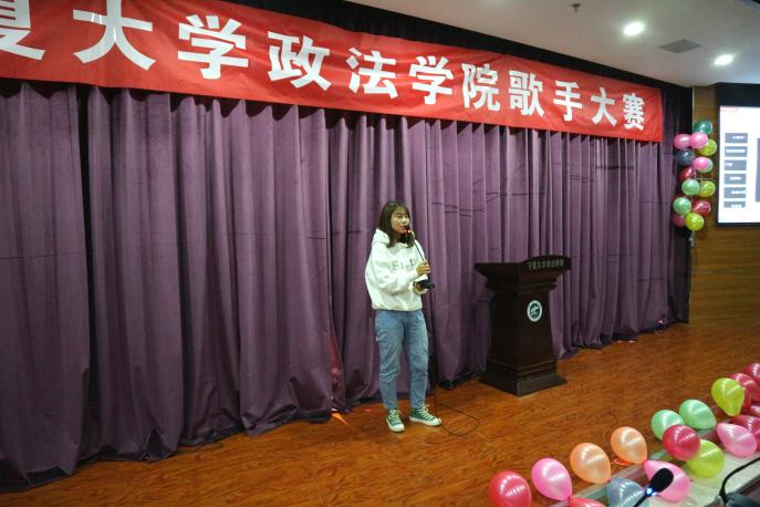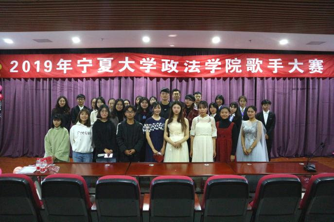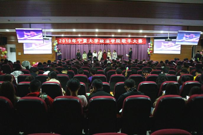 于模拟法庭举办“笙歌四起,唱响年华”歌手大赛决赛。2017级杨家磊、马静雯、贺婧容、2018级黑心月担任评委,2019级全体学生到场观看。