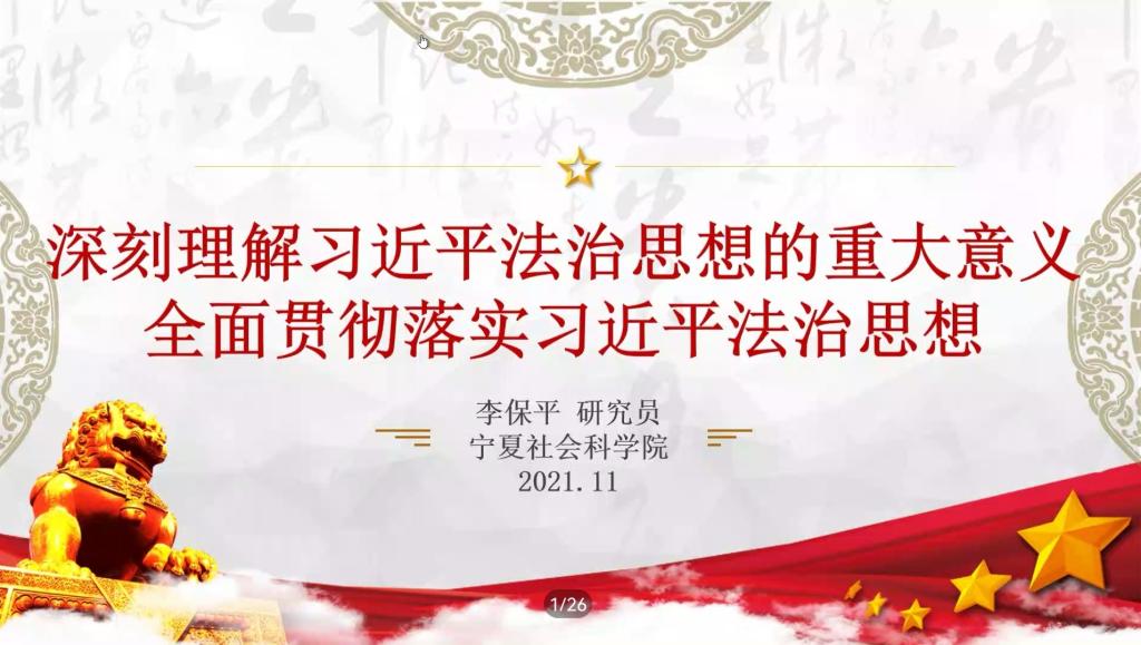 于11月3日下午组织开展《习近平法治思想概论》课程第二讲“习近平法治思想的重大意义”线上学习。本次讲座由宁夏社科院法学与社会学研究所所长李保平研究员主讲,黄瓜视频