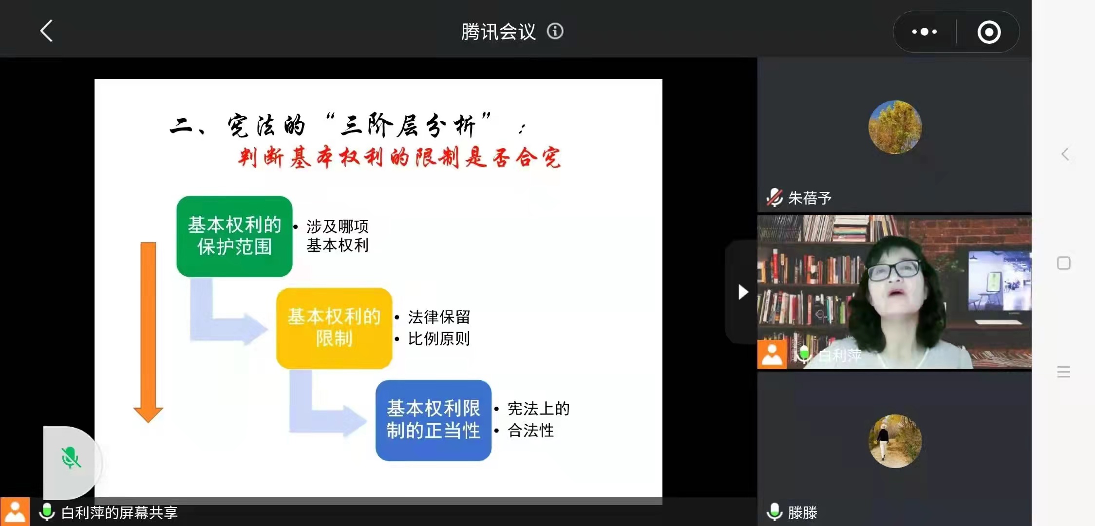 开展了对《宪法学》课程思政的教学研讨活动。白利萍老师为全院老师线上汇报了《宪法学》课程思政的建设情况;线上为学院宪法日主题活动作了题为“鉴定式:宪法基本权利案(事)例研习”的专题讲座;专任教师都参加了教育部主办的马工程《宪法学》第二版专题培训以及相关课程思政教学能力培训,宪法与行政法教研室老师共同学习和研讨了教育部发布的《宪法学教学重点指南》,形成共识,为《宪法学》课程思政建设集思广益,形成创新思路。