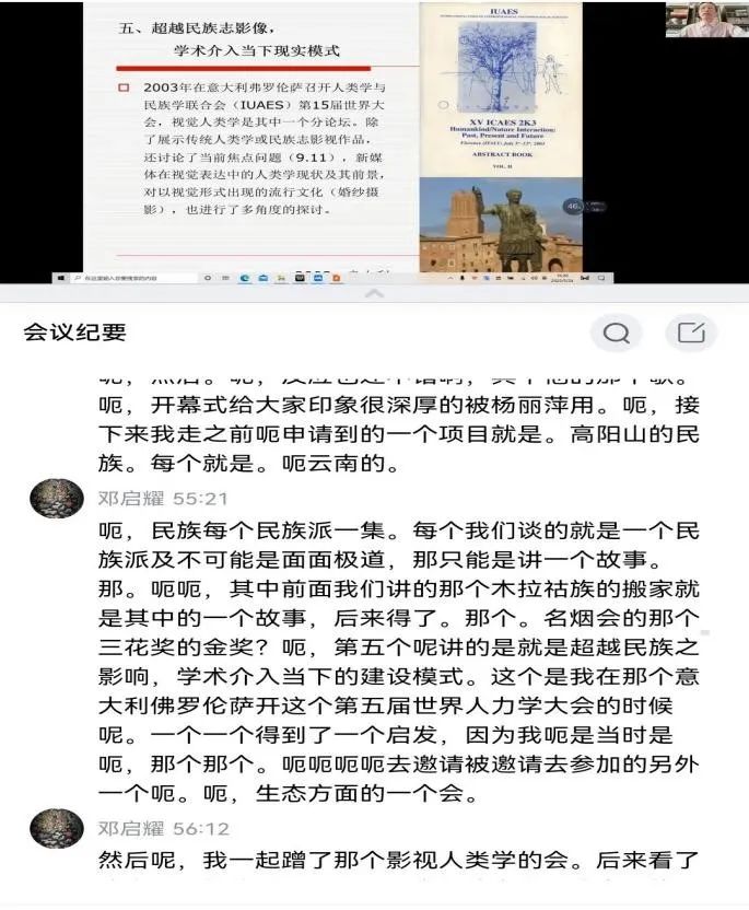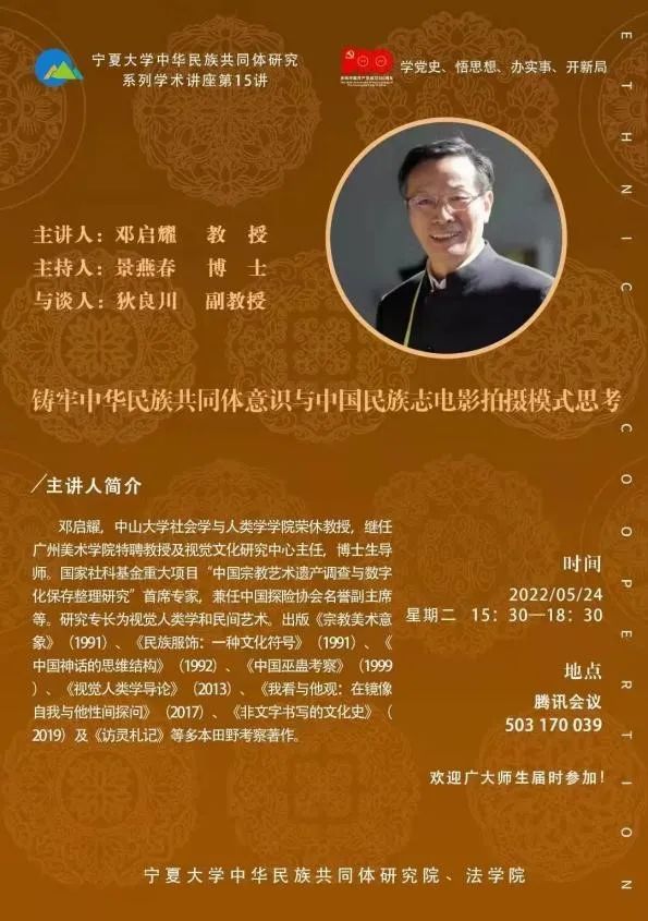 “2022年度铸牢中华民族共同体意识教育项目——铸牢中华民族共同体意识学术讲座(研讨会)之三”在线上举行,本期讲座特邀中山大学社会学与人类学学院荣休教授、广州美术学院特聘教授及视觉文化研究中心主任,博士生导师邓启耀为主讲人,主题为“铸牢中华民族共同体意识与中国民族志电影拍摄模式思考”。此次讲座由民族学专业教师景燕春主持,狄良川副教授为与谈人,民族学学科的师生聆听学习。