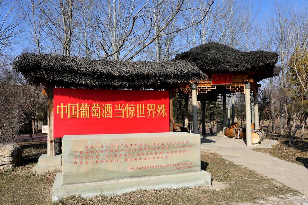活动伊始,师生团队一行先乘车到贺兰山运动公园“六九广场”,调研生态修复与文旅融合发展的典型案例。工作人员表示热情欢迎并详细介绍道:“源石酒庄与贺兰山生态运动公园依贺兰山而建,属于国家文化产业示范基地。这里曾经是一个废弃的砂石矿场,经过重新设计,将废石、废坑及各类废弃建筑材料重新利用,将中国文化和葡萄酒文明相融合,打造出了如今的立体式葡萄庄园和生态运动公园。”2021年,西夏区获批全国首个以葡萄酒产业为主导产业的国家现代农业产业园,2023年顺利通过认定。自获批以来,西夏区充分发挥资源、区位、生态、科研、人才、文化等优势,以产业融合发展为主线,进一步延伸葡萄酒产业链条,促进“葡萄酒+文旅”深度融合,着力打造贺兰山东麓葡萄酒产业核心区,走出了一条葡萄酒产区推进乡村产业振兴的新路子。