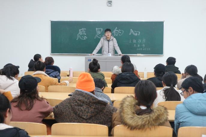 奖助学金管理规定》,随后各班通过ppt讲解、讨论交流、主题发言等丰富多样的形式共诉感恩之情。接着学院从获得2018年国家奖学金、国家励志奖学金、以及感恩中国近现代科学家奖助学金中遴选了较突出的学生分别在各班分享自己在学习、竞赛、科技创新、回报社会等方面的经历及取得的成绩,如2016级思政专业包道广作为感恩中国近现代科学家奖学金的获得者,前不久刚刚获得共青团中央“强国一代新青年称号”,他的励志故事深深鼓舞着所有的同学。