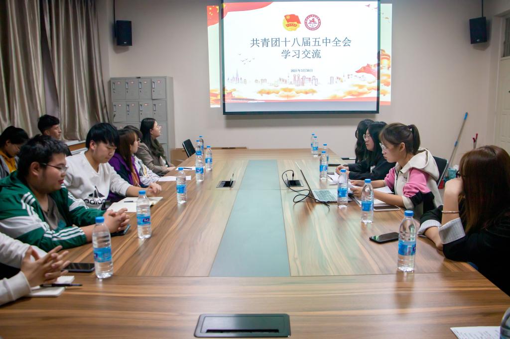 3月30日晚于文荟楼806会议室组织院团委学生干部及各班级团支部书记召开专题学习研讨会,共同学习共青团十八届五中全会精神。会议由团委副书记杨草源主持。
