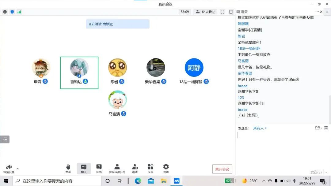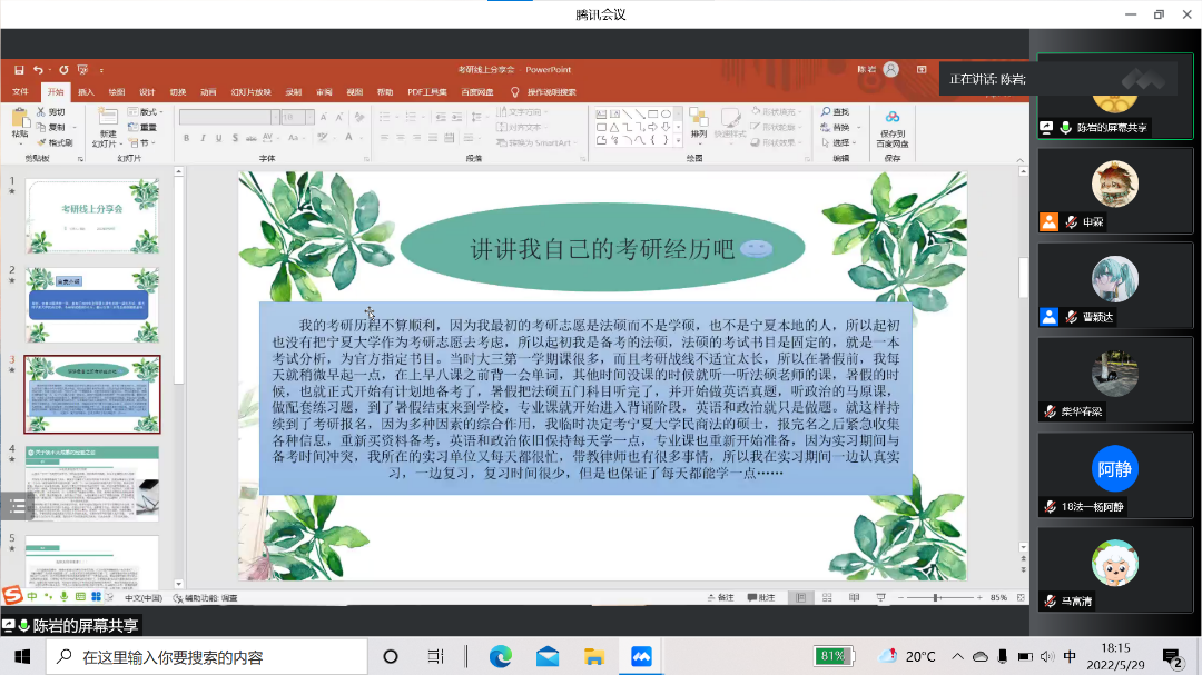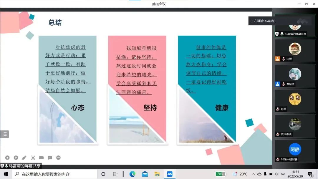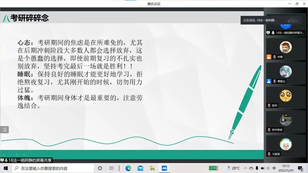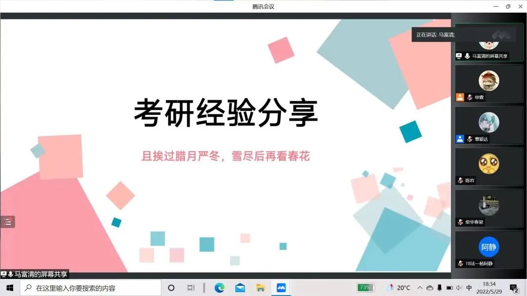 通过线上形式举办考研经验分享会。会议由申霖、曹颖达主持,杨阿静、马富清、陈岩、柴华春梁四位2018级学生分享了各自考研的心得和经历。
