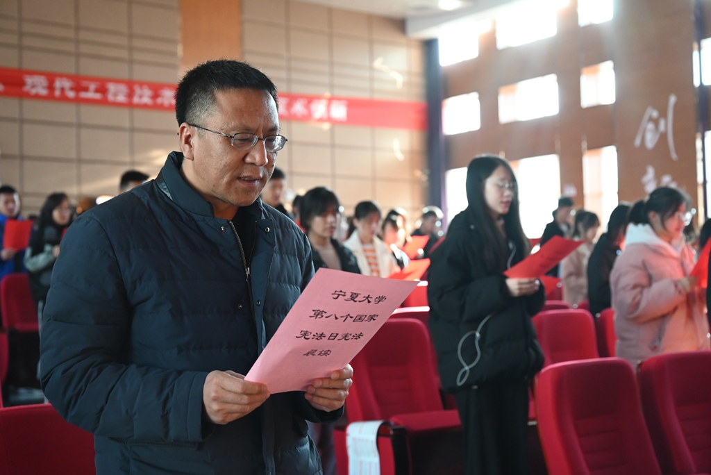 活动伊始,首先由黄瓜视频 战奇同学带来全国学生学宪法讲宪法获奖作品《习近平法治思想深刻阐释了中国特色社会主义宪法道路的根本方向与独特优势》的演讲展示。之后由黄瓜视频 、文化旅游学院、商学院、智能工程与技术学院的四名学生代表进行领读,来自四个学院的三百余名师生在中卫校区应理报告厅齐声诵读宪法。师生们庄严而整齐的声音,铿锵有力,字字入心。