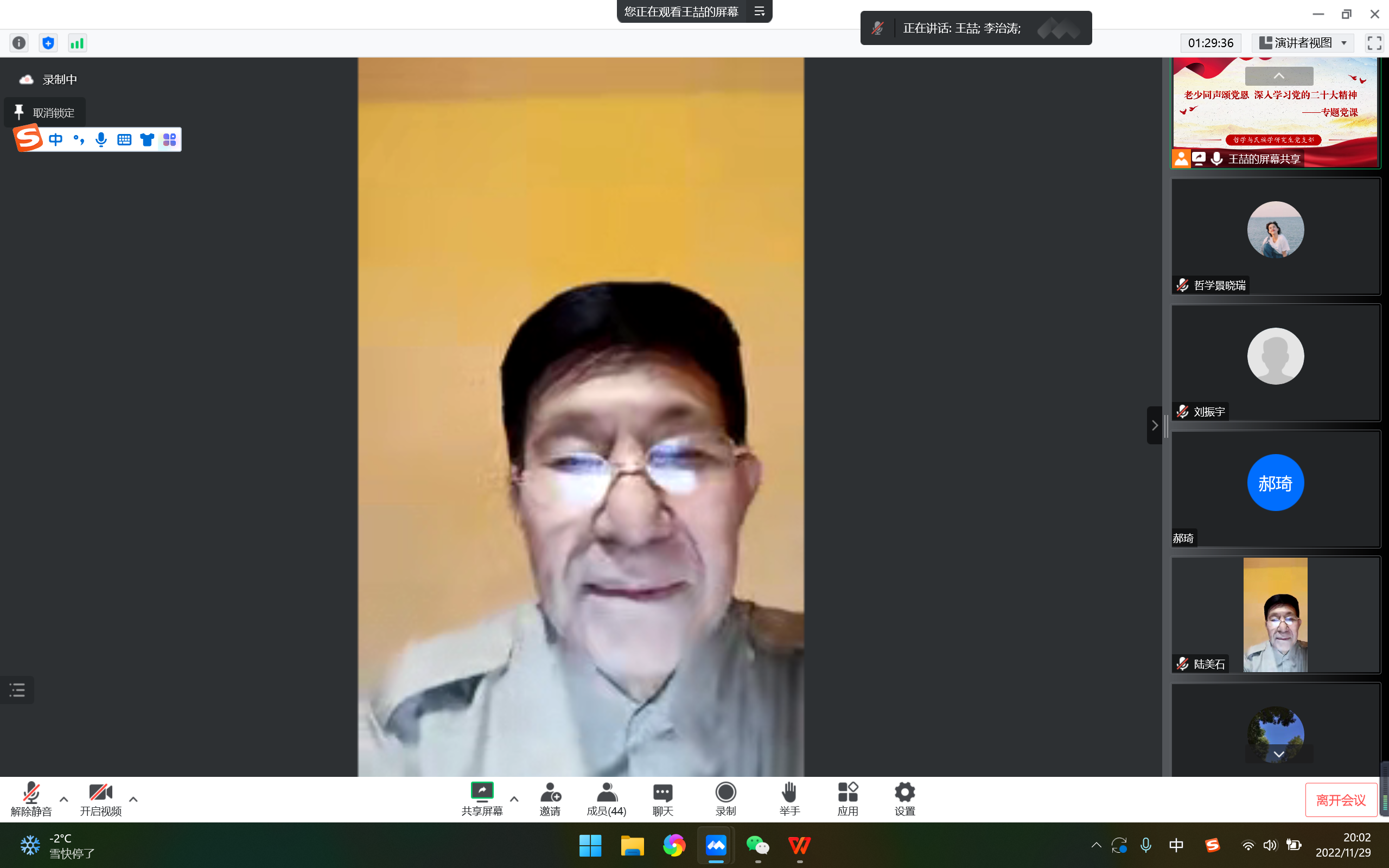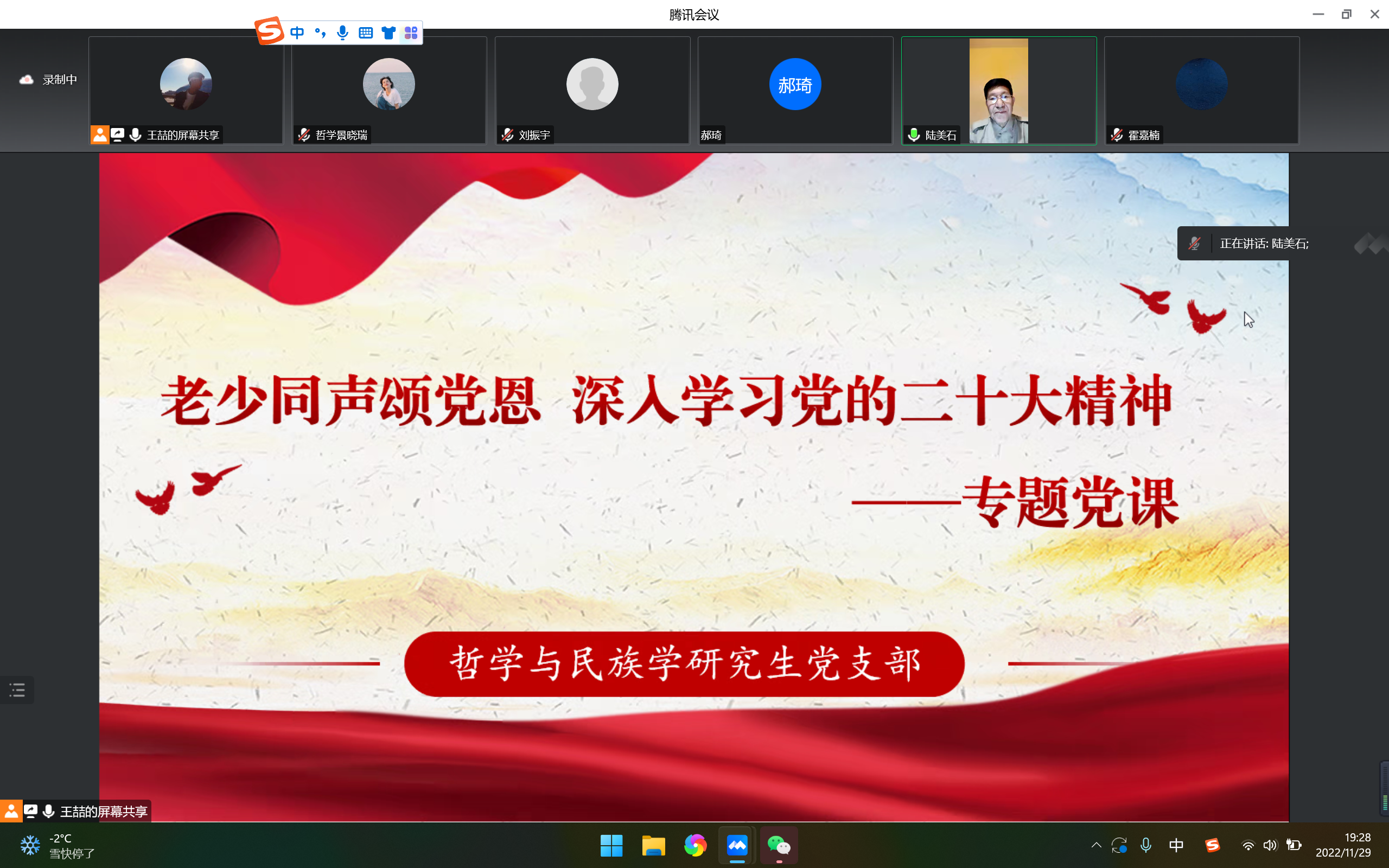 为进一步增强支部党员党性修养,深入学习党的二十大精神,11月29日晚7点,哲学与民族学研究生党支部以线上形式,召开“老少同声颂党恩,深入学习党的二十大精神”专题党课。学院党委书记李治涛,党委委员、副院长刘振宇,黄瓜视频 关工委副主任、关工委“五老”报告团团长陆美石应邀参加,支部全体党员、发展对象和入党积极分子共同学习。会议由支部组织委员王喆主持。