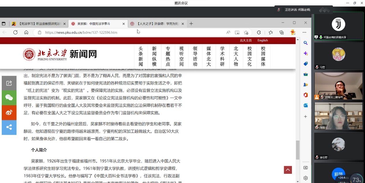 2022年12月3日,法律系本科生党支部于国家宪法日来临之际,在腾讯会议线上召开主题党日活动,会议由党支部书记何磊主持,支部全体党员同志参加。
